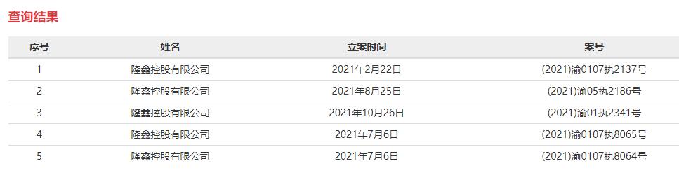 隆鑫控股以破产重整告终,事实上早有预兆。执行信息公开网显示,2021年7月6日-2022年2月22日,7个月时间内隆鑫控股已5次被纳入失信被执行人名单。