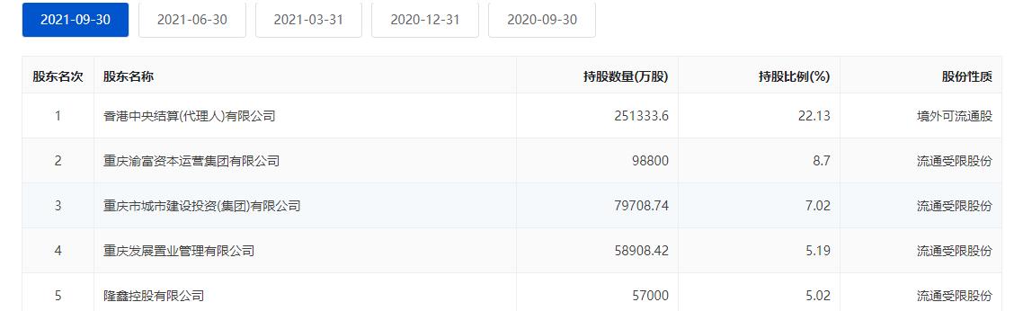 另据巨潮资讯网,截至去年9月末,隆鑫控股位列渝农商行第五大股东。持股数量为5.7亿股,持股比例为5.02%,股份性质为流通受限股份。