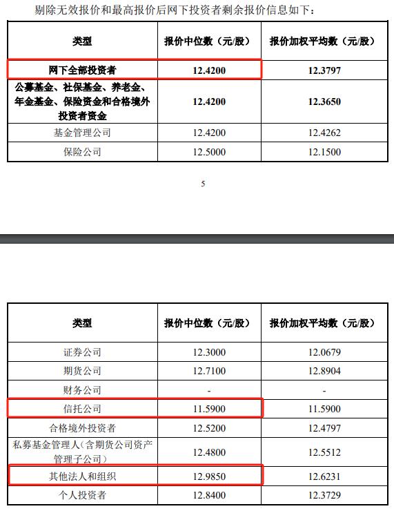 剔除无效报价和最高报价后,参与初步询价的投资者为694家,配售对象为7744个,全部符合《发行安排及初步询价公告》规定的网下投资者的参与条件。据统计,所有网下投资者报价中位数为12.42元/股;信托公司报价中位数最低,为11.59元/股;其他法人和组织报价中位数最高,为12.985元/股。