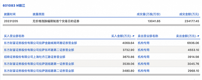 12月5日,锦江航运今日涨58.58%,全天换手率达69.26%,振幅达29.6%。龙虎榜数据显示,营业部席位合计净卖出2924.32万元。其中,机构合计净卖出2.14亿元。此外,东方财富证券拉萨金融城南环路证券营业部、东方财富证券拉萨东环路第二证券营业部分别买入4069.64万元、3732.90万元。