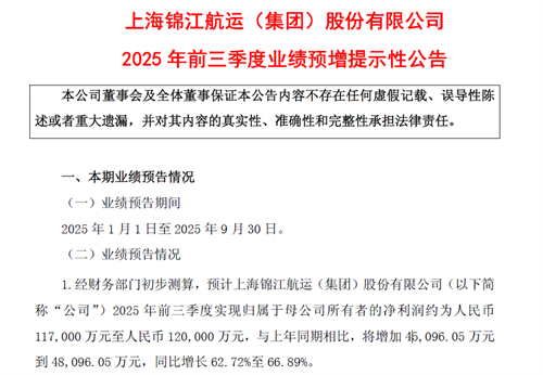 10月15日,上海锦江航运(集团)股份有限公司发布2025年前三季度业绩预增提示性公告。