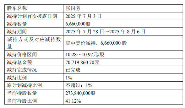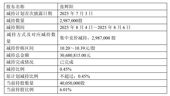 公司实际控制人一致行动人、董事长张辉阳于2025年8月4日至2025年8月6日期间,通过集中竞价交易方式减持公司股份2,987,000股,占公司总股本的0.45%;本次减持后,张辉阳当前持有公司股份40,050,000股,持股比例6.01%。减持总金额为30,680,815.00元。