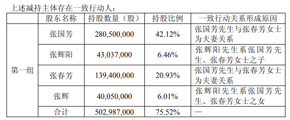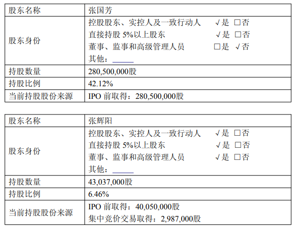 本次减持计划实施前,控股股东、实际控制人之一张国芳持有公司无限售流通股份280,500,000股,有限售流通股份0股,合计持有280,500,000股,占公司总股本42.12%。上述股份来源于公司首次公开发行股票前取得的股份。