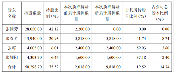 国芳集团7月22日披露的关于控股股东、实际控制人股份质押解除的公告显示,截至公告披露日,张国芳、张春芳、张辉、张辉阳合计持股50,298.70万股,持股比例为75.52%;本次质押解除后累计质押数量为9,818.00万股,占其所持股份比例的19.52%,占公司总股本比例的14.74%。