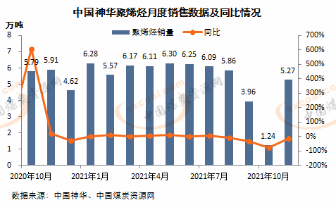 11月份,中国神华合计销售5.27万吨聚烯烃产品,同比减少0.64万吨,下降10.83%,环比增加4.03万吨,增长325%。