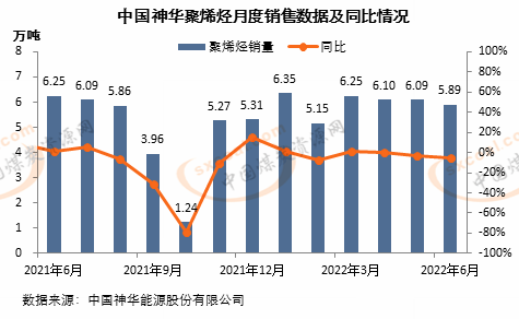6月份,中国神华合计销售5.89万吨聚烯烃产品,同比减少0.36万吨,下降5.8%,环比减少0.2万吨,下降3.3%。