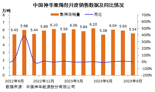 2023年1-9月,中国神华累计销售聚烯烃52.65万吨,同比微增0.1%。其中,销售聚乙烯26.91万吨,同比增长0.2%;销售聚丙烯25.74万吨,同比持平。