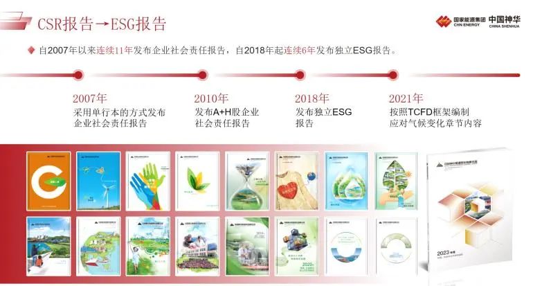 中国神华从2007年度首次采用了单行本的方式发布了企业社会责任报告。2019年起,主动适应资本市场关注和监管规则变化,开始发布独立ESG报告。公司ESG报告在全面遵循港交所和上交所监管规定的基础上,参考了全球可持续发展标准委员会GRI的标准要求,并重点对标国内外主流评级标准进行编制。