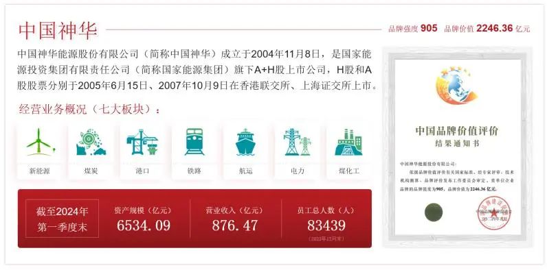 中国神华成立于2004年11月8日,是国家能源集团旗下A+H股旗舰上市公司,H股和A股股票分别于2005年和2007年在香港联交所和上海证交所上市,在普氏能源资讯“全球能源公司2022年250强”榜单中位列13、中国企业第3位;在《财富》中国上市公司500强中排名第42位,居煤炭类上市公司首位;位列“2024中国品牌价值评价信息”榜单能源化工板块第5名、蝉联能源化工类上市公司第1名,获评2246.36亿元,较去年增长190.27亿元。2024年6月,中国神华再获Wind ESG AA级评价,这也是中国神华连续四年获得AA级评价,7月29日,中国神华企业管理与法律事务部三级主管杨玲女士出席“中国上市公司ESG洞察”系列活动,与投资者分享中国神华作为能源央企的ESG治理路径探索与模式创新。