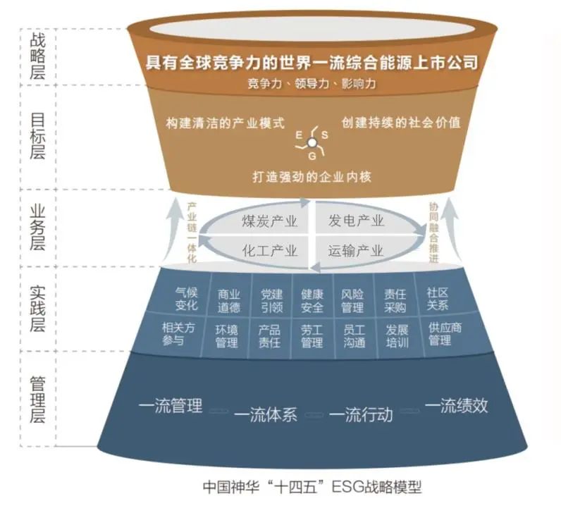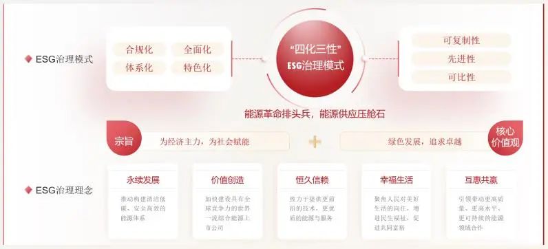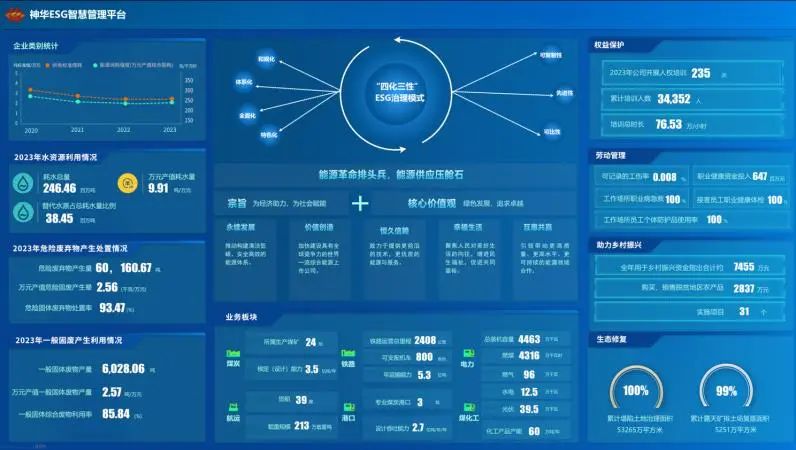 公司通过不断探索,逐步确立了“系统思考、整体布局,理顺机制、嵌入管理,循序渐进、务求实效”的 ESG 总体工作思路,建立了以数字化转型为抓手、信息化建设为支撑的ESG治理体系,打造形成了合规化、体系化、全面化、特色化,树立可复制性、先进性、可比性的,具有中国神华特色的“四化三性”一流ESG治理模式。