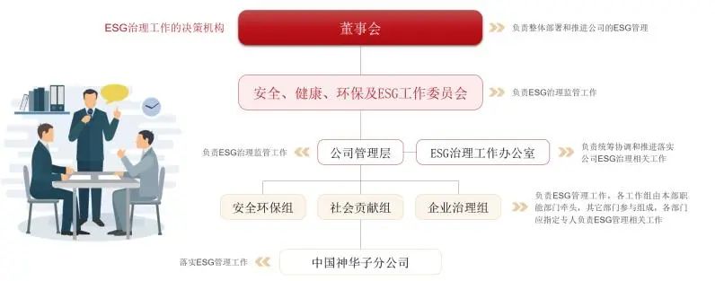 中国神华建立了董事会决策、董事会专门委员会,即:安全、健康、环保及ESG工作委员会和审计委员会监管、管理层推进、由总部各部门组成的安全环保组、社会贡献组和企业治理组等3个专业工作组,以及各子分公司落实的ESG组织体系架构,推动公司各部门和所属企业将ESG的理念、要求融入公司发展战略和日常生产经营管理。其中,董事会全面深度参与ESG工作,对公司ESG策略及汇报承担全部责任,监察可能影响公司发展、业务运作或股东权益的ESG事宜。