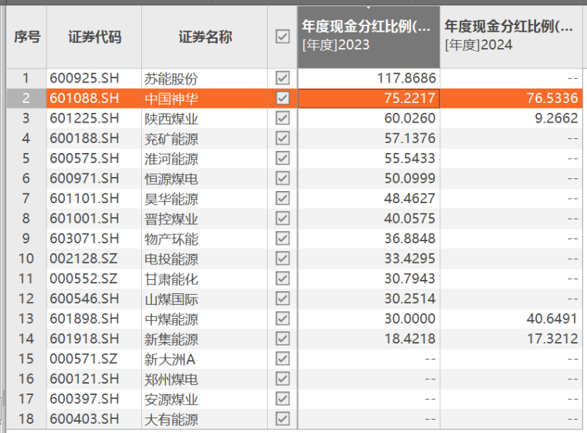 此外,中国神华的现金分红占归母净利润的比例,在动力煤板块同样少见。2023年的75%排在第二,2024年的76.5%,在已经有数据的上市公司中排第一。