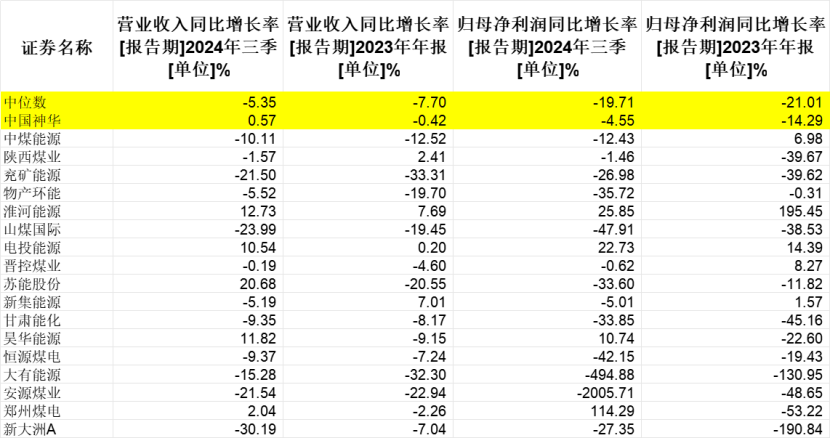 此外,2024年前三季度,中国神华归母净利润同比增长率为-4.55%,2023年则为-14.29%,同期动力煤板块的中位数分别为-19.71%和-21.01%。