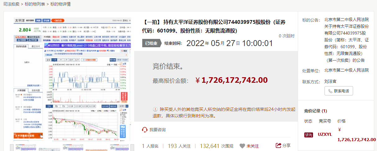 5月27日,北京产权交易所官网信息显示,北京市第二中级人民法院处置的太平洋7.44亿股股份,于5月26日10时开始网拍,并于5月27日10时结束。
