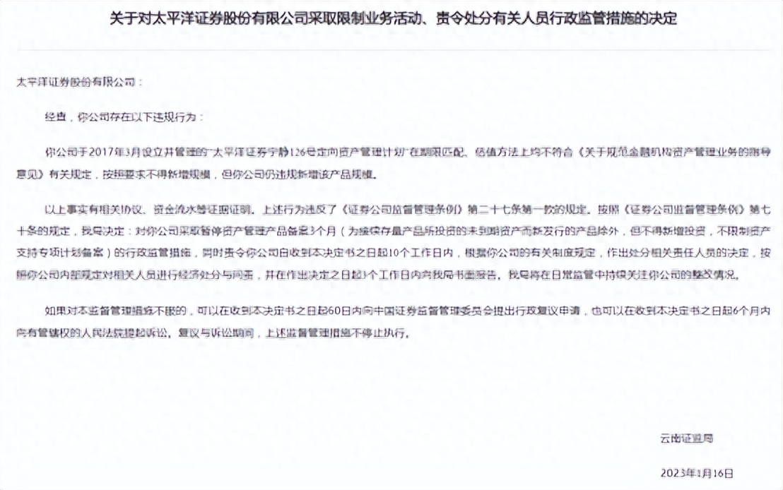 值得一提的是,今年1月16日,太平洋证券因在2017年3月设立并管理的“太平洋证券宁静126号定向资产管理计划”违规新增该产品规模,被云南证监局采取暂停资产管理产品备案3个月、责令处分有关人员的行政监管措施。