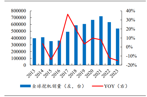 图1:2023年全球挖掘机销量54万台,近十年CAGR为5%