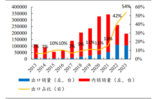 图2:2023年中国挖掘机销量19万台(含出口),其中出口占比54%