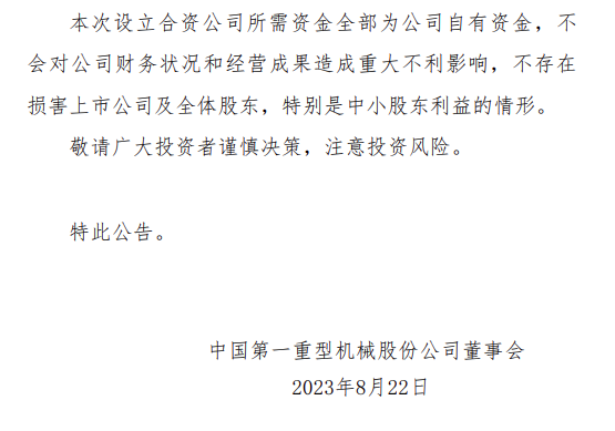 8月22日,中国一重发布《中国第一重型机械股份公司关于对外投资设立合资公司的公告》。