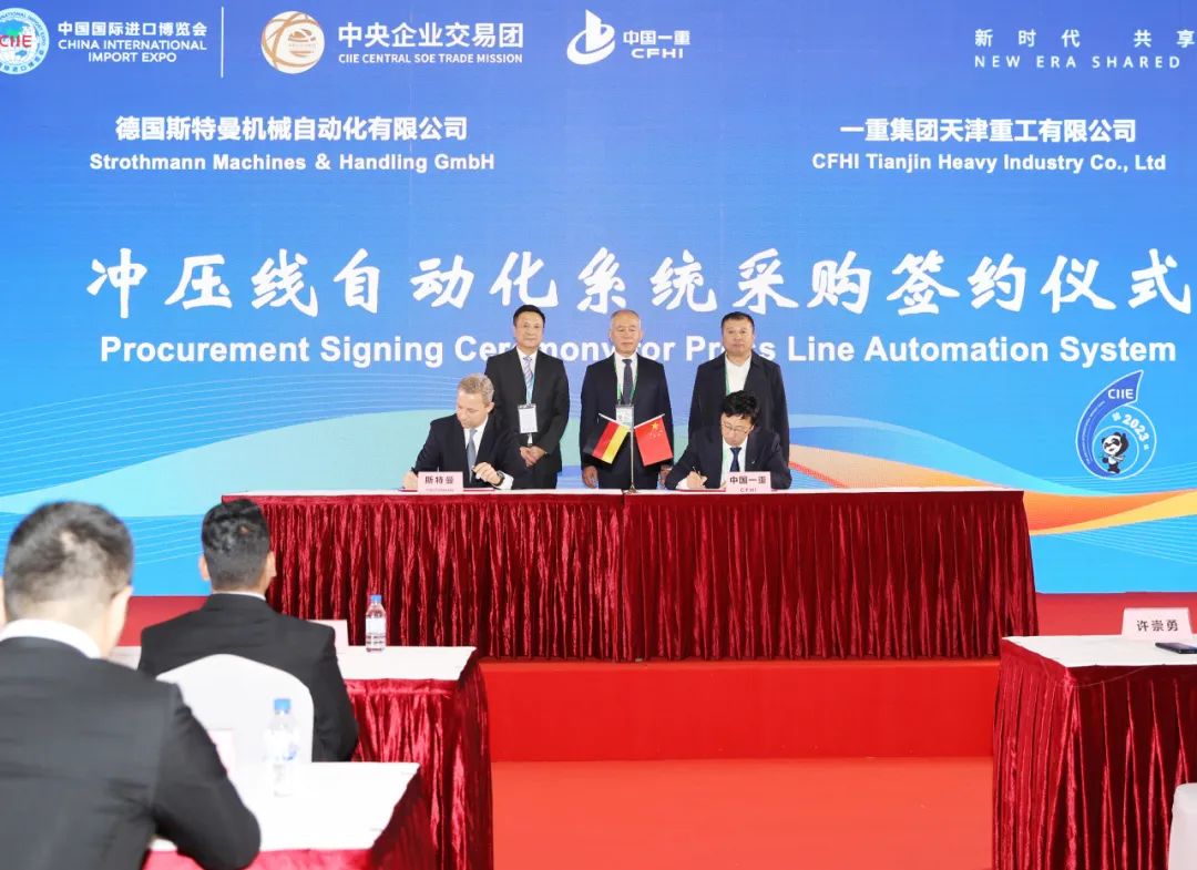 11月6日,中央企业交易团中国一重交易分团举办第六届中国国际进口博览会主场签约仪式,分别与舍弗勒贸易(上海)有限公司、德国斯特曼机械自动化有限公司、富力拓国际贸易公司、赛拓瑞投资有限公司签订采购协议。