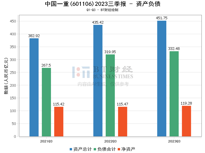 从资产负债方面来看,截至2023年三季度末,中国一重的总资产达到451.75亿元,相较上年度末的412.61亿元增长了9.49%。负债合计为332.48亿元,较上年度末的293.95亿元增加,净资产则略有增长至119.28亿元。资产负债率为73.6%,较上年度末的71.24%有所上升,这可能反映了公司在扩张及转型过程中的资本投入。