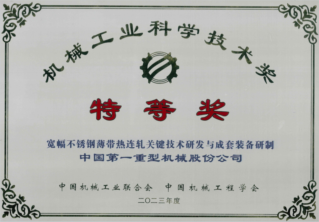 中国一重“宽幅不锈钢薄带热连轧关键技术研发与成套装备研制”项目斩获“机械工业科学技术奖”特等奖、中国“好设计”金奖。首创“1+8”宽幅不锈钢热连轧生产线工艺配置,自主设计了不锈钢薄带热连轧成套装备,构建出不锈钢全系列变形抗力数据库和多规格轧线数据库,实现多品种不锈钢热轧产品厚度宽度规格极限的突破,有效提升了热连轧生产线总体设计的数字化、智能化水平,总体技术达到国际先进水平,关键核心技术达到国际领先水平。该成果应用占据国内同类设备市场90%以上,增强了我国高端冶金装备领域的核心竞争力。