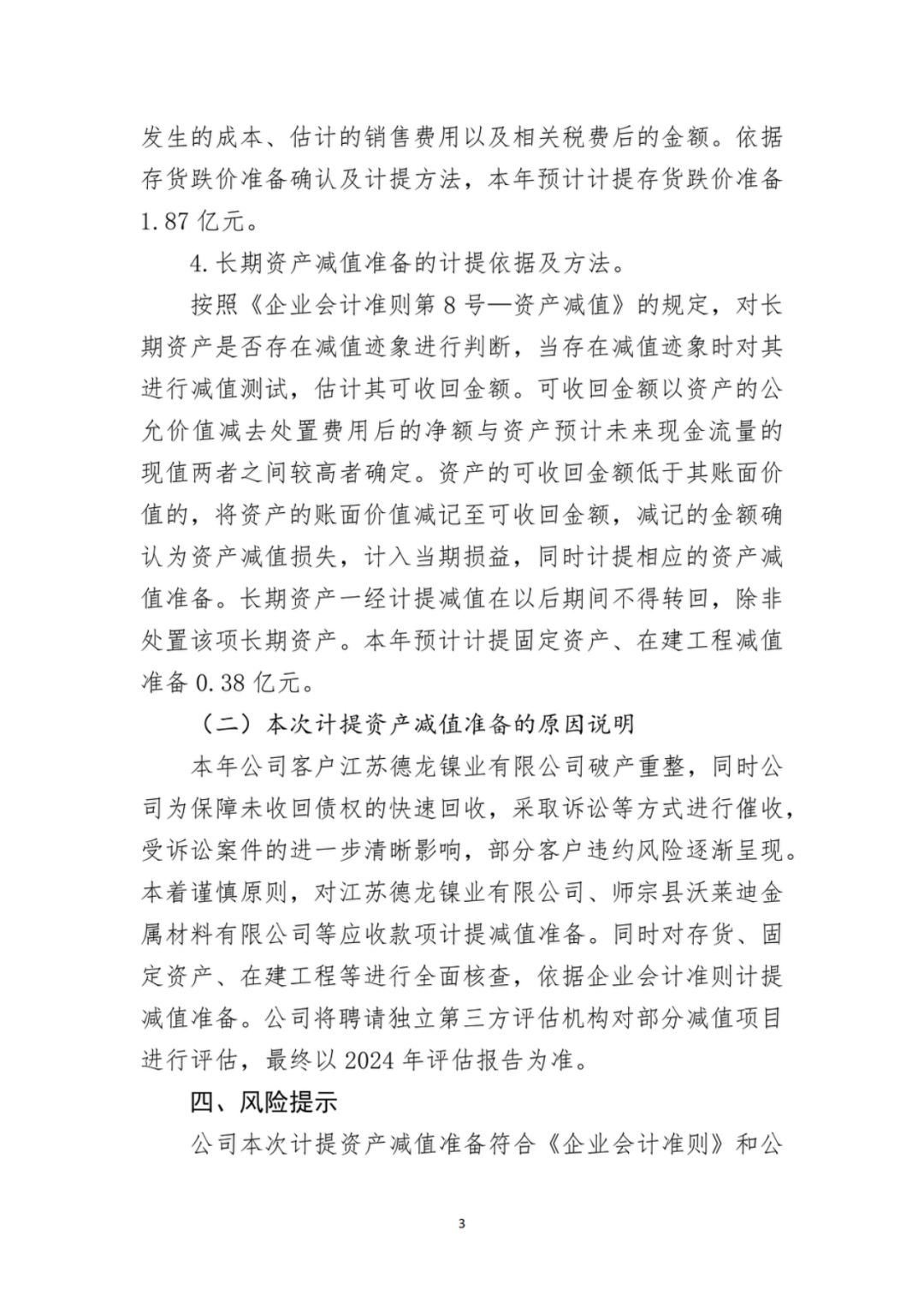 此次计提减值准备的原因主要是由于客户江苏德龙镍业有限公司破产重整,导致公司面临未收回债权的风险,同时部分客户的违约风险逐渐显现。公司表示,此次减值准备符合相关会计准则,旨在更真实、公允地反映公司的资产状况和经营成果。