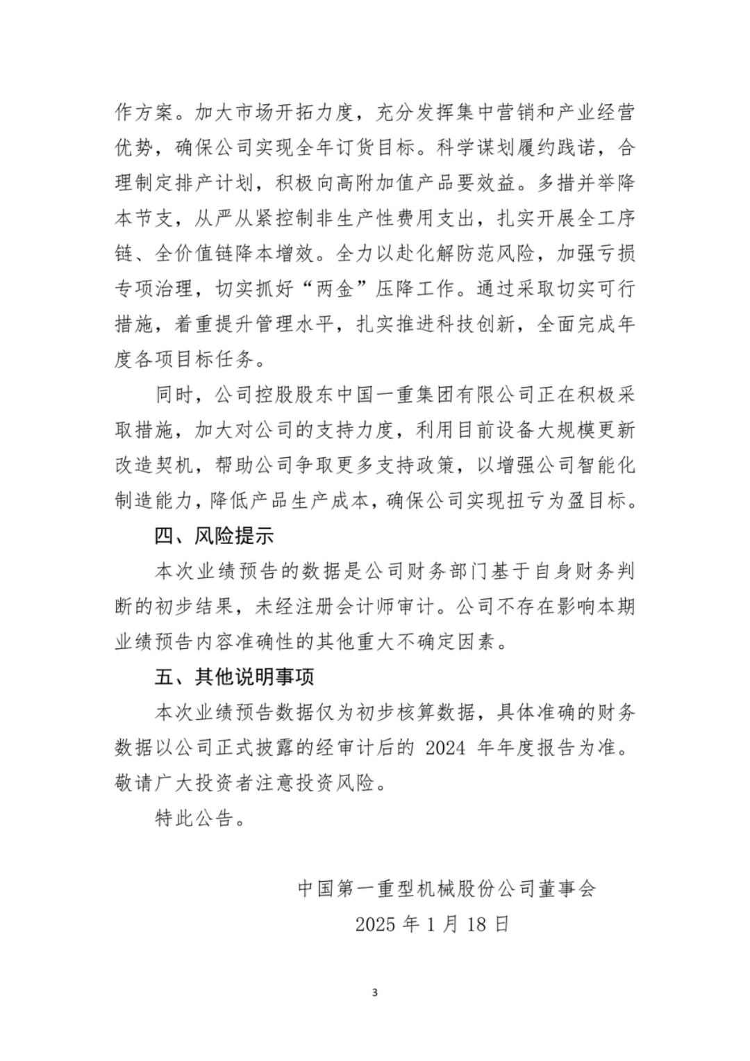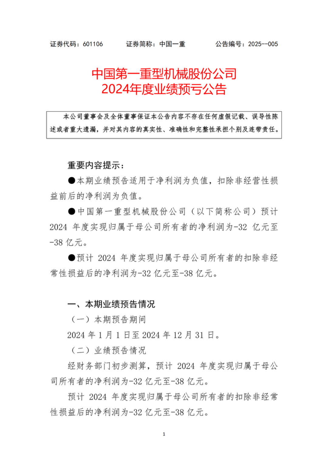 同日,中国一重发布业绩预告称,预计2024年度归母净利润将亏损32亿元至38亿元,扣除非经常性损益后的净利润同样为-32亿元至-38亿元。该业绩预告适用于净利润为负值,且未经注册会计师审计。