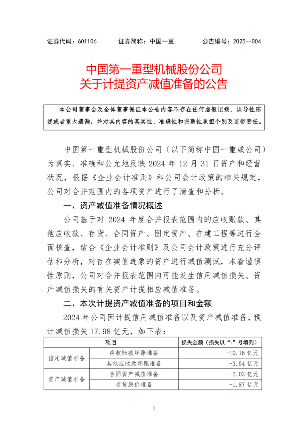 1月17日,中国一重(601106.SH)发布公告,公司对2024年度合并报表范围内的各项资产进行了全面核查,决定计提资产减值准备,总额预计为17.98亿元。具体项目包括:应收账款坏账准备10.16亿元、其他应收款坏账准备3.54亿元、合同资产减值准备2.03亿元、存货跌价准备1.87亿元以及固定资产和在建工程减值准备0.38亿元。