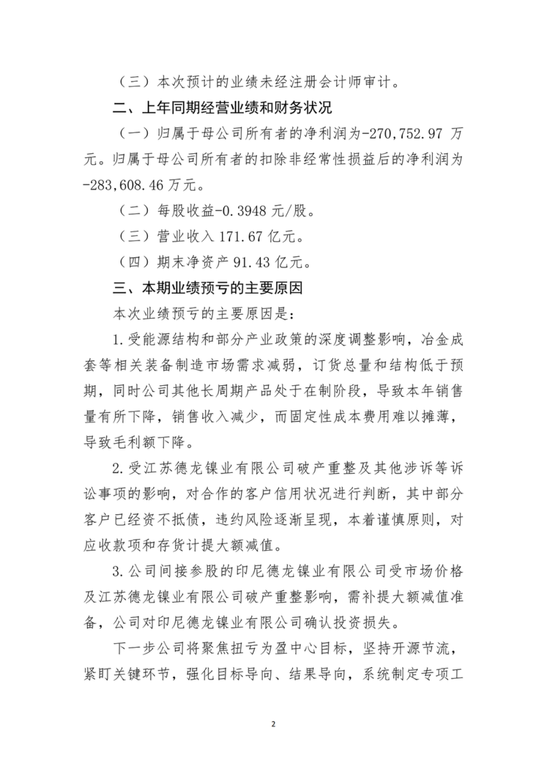 3、公司间接参股的印尼德龙镍业有限公司受市场价格及江苏德龙镍业有限公司破产重整影响,需补提大额减值准备,公司对印尼德龙镍业有限公司确认投资损失。