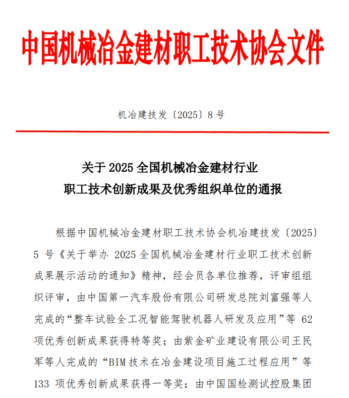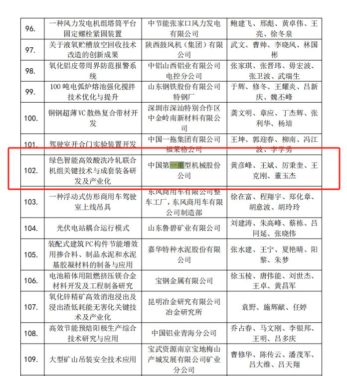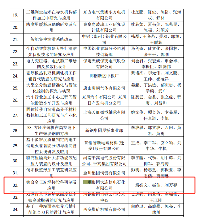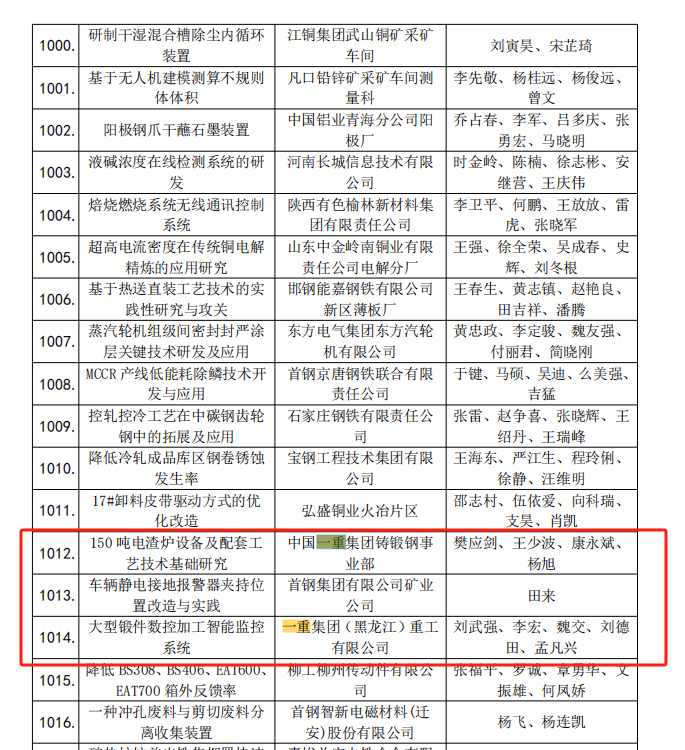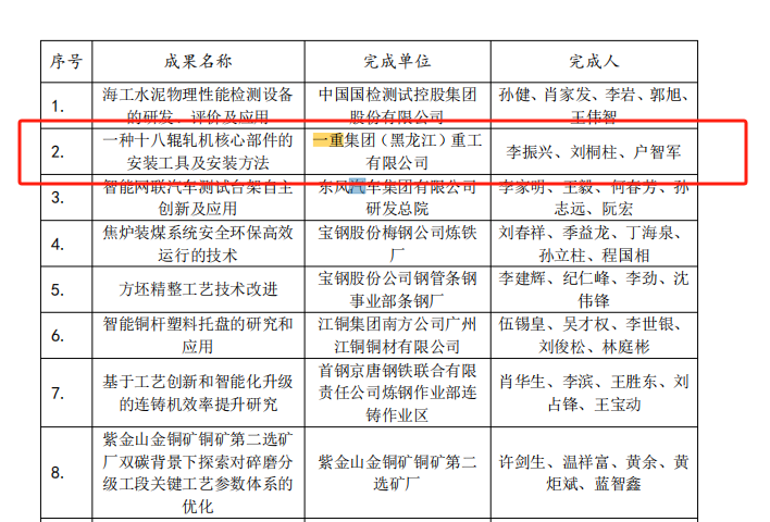 近日,中国机械冶金建材职工技术协会公布了2025年全国机械冶金建材行业职工技术创新成果获奖名单。一重龙江重工《一种十八辊轧机核心部件的安装工具及安装方法》、一重工程技术《绿色智能高效酸洗冷轧联合机组关键技术与成套装备研发及产业化》、一重核电石化《钛合金TIG焊接设备研制及应用》荣获全国机械冶金建材行业职工技术创新成果二等奖;一重龙江重工《大型锻件数控加工智能监控系统》、一重铸锻《150吨电渣炉设备及配套工艺技术基础研究》荣获全国机械冶金建材行业职工技术创新成果三等奖。