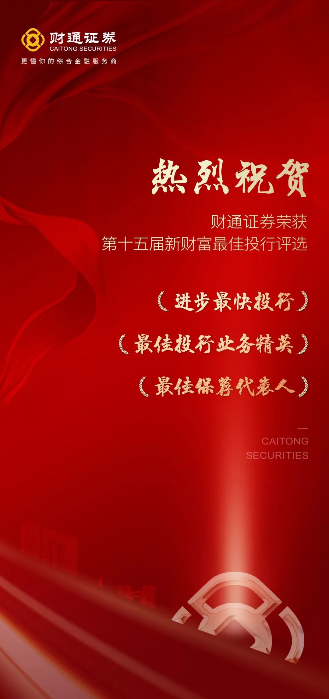 2022年3月24日,“第十五届新财富最佳投行评选”榜单出炉,财通证券凭借优质的金融服务和出色的业务表现,在众多优秀的金融机构中脱颖而出,荣获“进步最快投行”、“最佳投行业务精英(王为丰)”、“最佳保荐代表人(成政)”三大奖项!