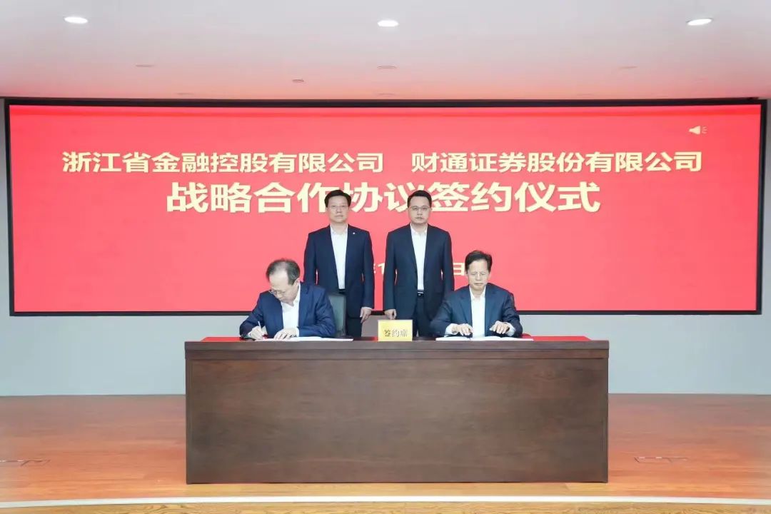 10月26日,财通证券与浙江金控签订战略合作协议。财通证券党委书记、董事长章启诚,省财政厅党组成员,浙江金控党委书记、董事长杨强民见证签约并讲话。财通证券总经理、党委副书记、董事黄伟建,总经理助理申建新,董事会秘书官勇华;浙江金控党委副书记、董事、总经理任潮龙,党委委员、副总经理侯兴钏,以及双方相关部门负责人出席会议。