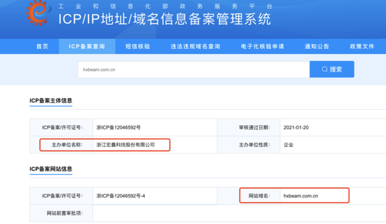 工信部政务服务平台显示网址hxbeam.com.cn,ICP备案主体信息浙江宏鑫科技股份有限公司,ICP备案网站信息hxbeam.com.cn,也就是该网站为宏鑫科技官方网站。