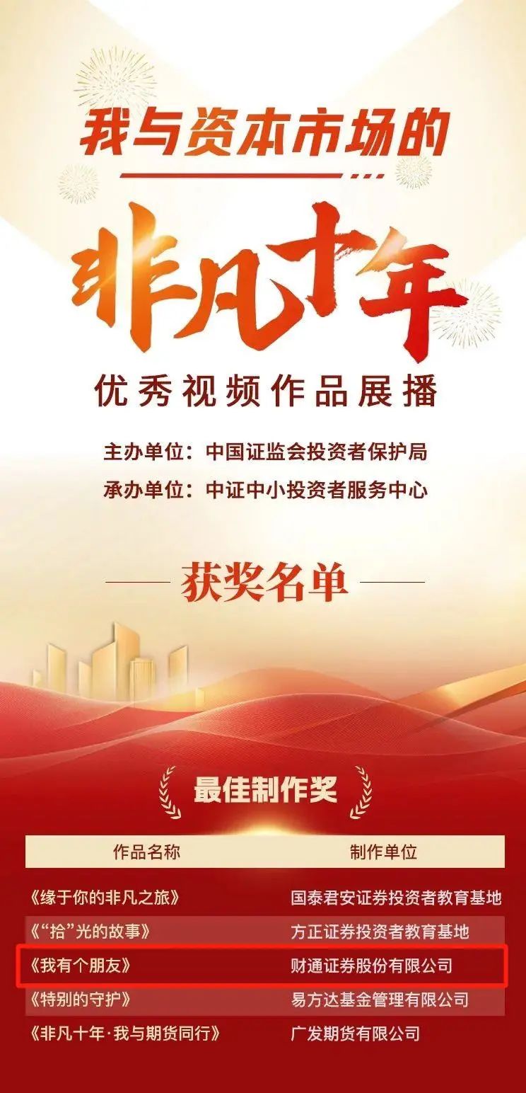 近日,由中国证监会投资者保护局主办、中证中小投资者服务中心(以下简称投服中心)承办的“我与资本市场的非凡十年”主题活动评选结果正式揭晓。由浙江证监局推荐、财通证券投教基地制作的《我有个朋友》视频获“最佳制作奖”,系浙江辖区唯一获奖作品。