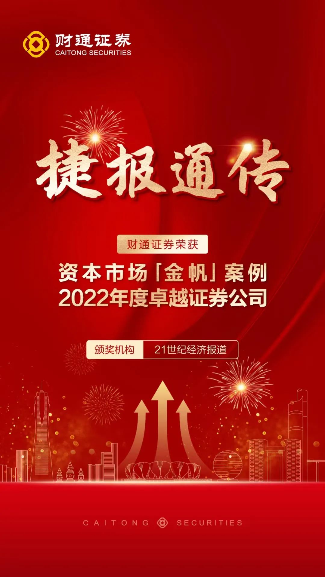 12月14日,由南方财经全媒体集团和广东省工商业联合会(总商会)联合主办、专业财经媒体《21世纪经济报道》承办的资本市场「金帆」案例评选结果揭晓,财通证券凭借优异的综合表现从多家参评券商中脱颖而出,荣获“资本市场「金帆」案例·2022年度卓越证券公司”。