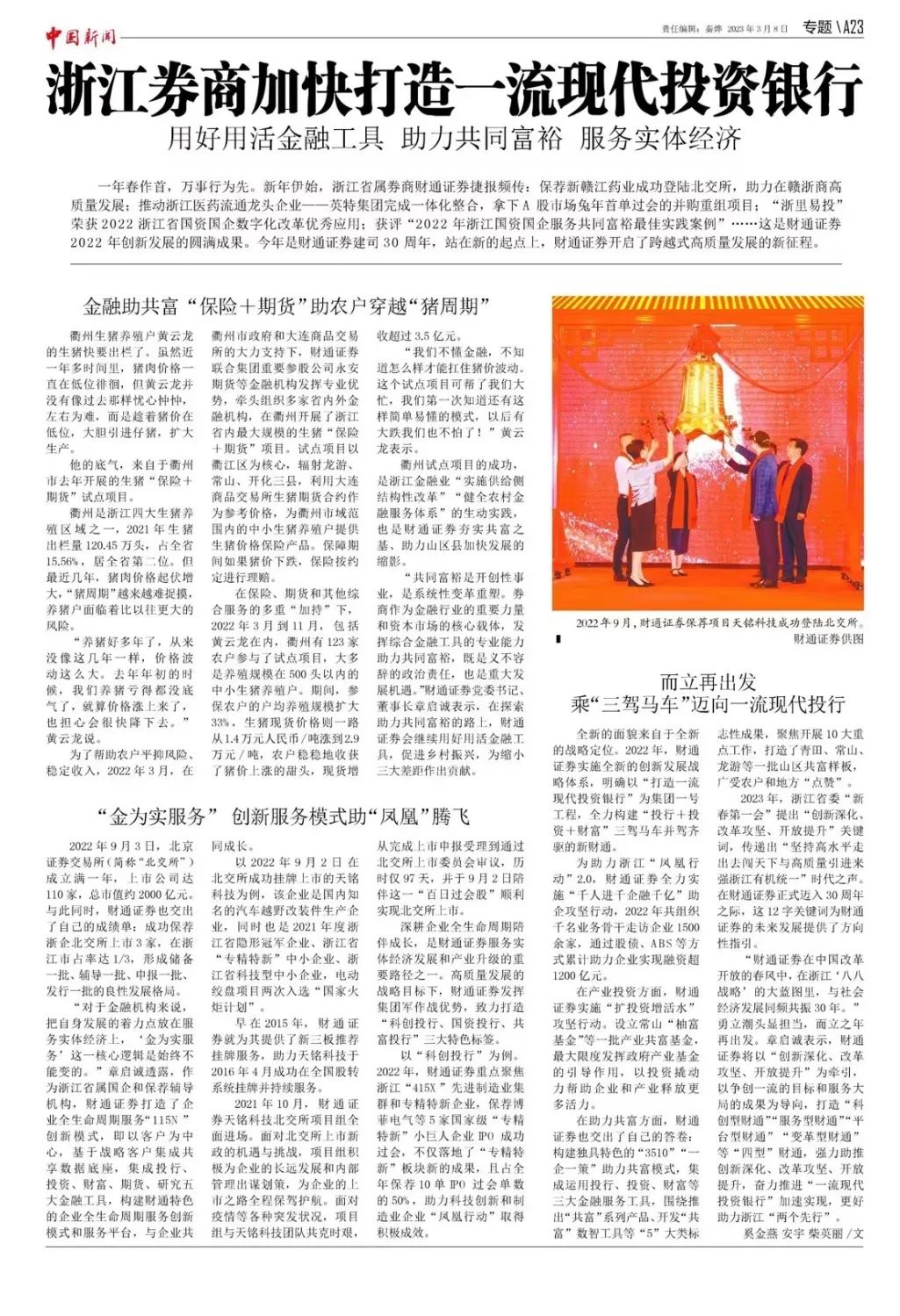 《中国新闻》2023年3月8日A23版刊发,《浙江券商加快打造一流现代投资银行,用好用活金融工具,助力共同富裕,服务实体经济》