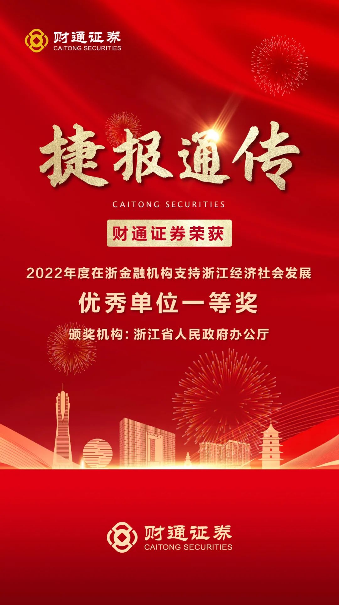 日前,浙江省人民政府办公厅印发了《2022年度在浙金融机构支持浙江经济社会发展评价激励结果的通报》,财通证券再次获评“在浙金融机构支持浙江经济社会发展优秀单位一等奖”,这也是财通证券继2017年以来第六次登榜。