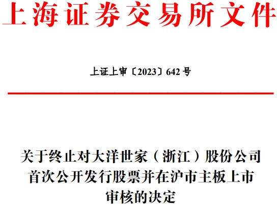 2023年7月24日,大洋世家的保荐人财通证券股份有限公司向上交所提交了《财通证券股份有限公司关于申请撤回大洋世家(浙江)股份公司首次公开发行股票并在主板上市申请文件的报告》(财券〔2023〕292号),申请撤销大洋世家(浙江)股份公司首次公开发行股票并在沪市主板上市保荐工作。根据《上海证券交易所股票发行上市审核规则》第六十三条的有关规定,上交所决定终止对大洋世家首次公开发行股票并在沪市主板上市的审核。