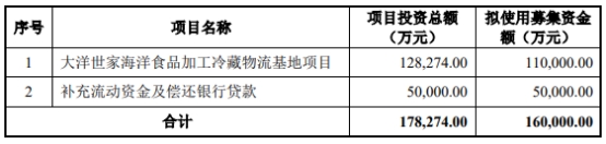 大洋世家拟在上交所主板公开发行不超过9,000.00万股,占发行后总股本的比例不低于25%(含本数),拟募集资金160,000.00万元,用于以下两个项目:“大洋世家海洋食品加工冷藏物流基地项目”、“补充流动资金及偿还银行贷款”。两个项目拟分别投入募资110,000.00万元和50,000.00万元。