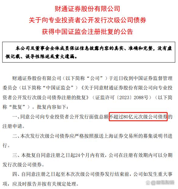 近期,财通证券发布公告称,中国证券会同意公司向专业投资者公开发行面值总额不超过80亿元次级公司债券的注册申请。