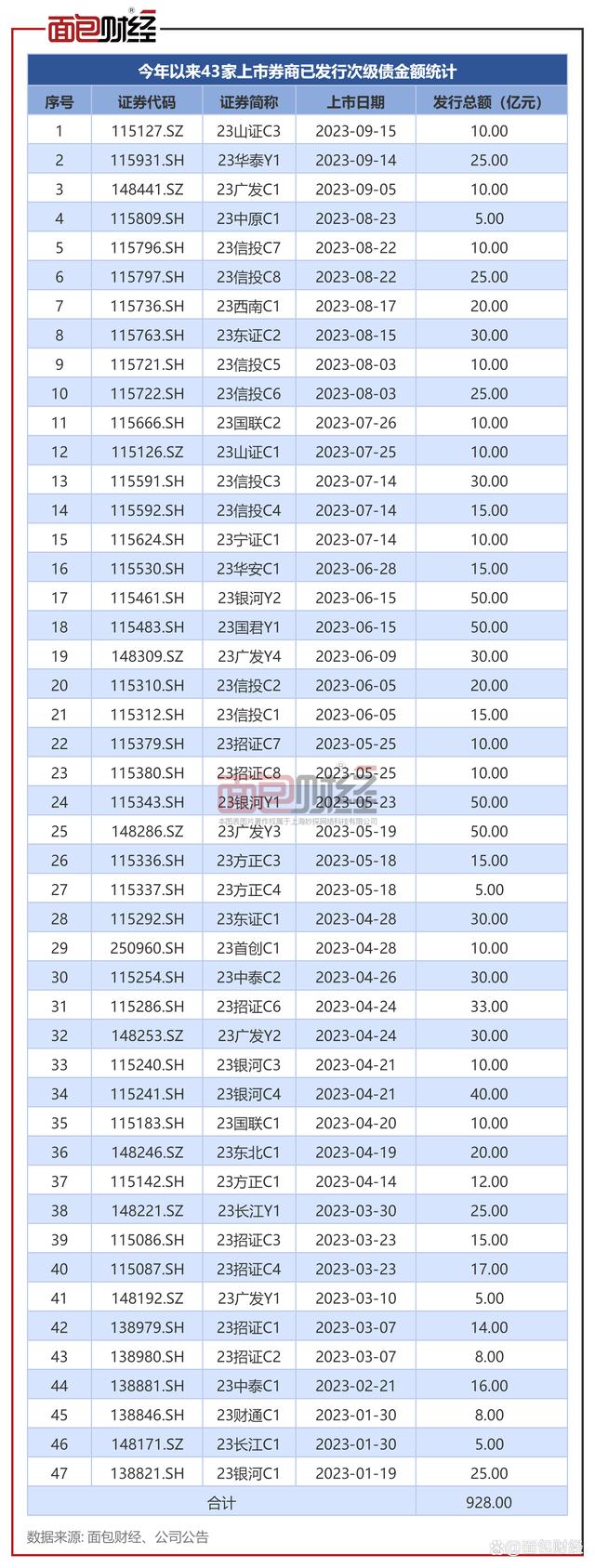 次级债发行方面,面包财经研究员统计发现,截至2023年9月27日,今年以来A股43家上市券商已发行次级债47只,发行总额达928亿元。