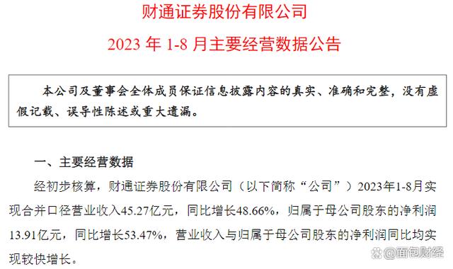 公告显示,该公司2023年1-8月实现合并口径营业收入45.27亿元,同比增长48.66%,归属于母公司股东的净利润13.91亿元,同比增长53.47%。