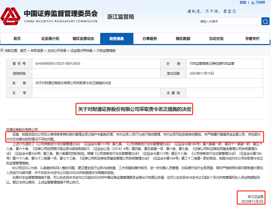 近期,浙江证监局发布对财通证券的处罚公告。财通证券因在从事债券承销和受托管理业务过程中未勤勉尽责,未对业务人员行为进行有效管理等行为,被浙江监管局采取责令改正措施。