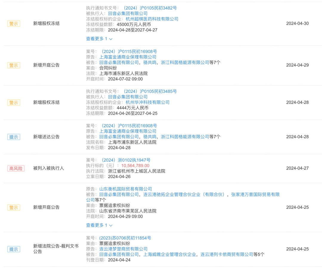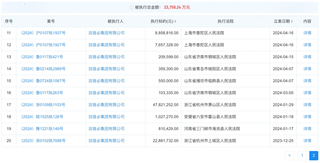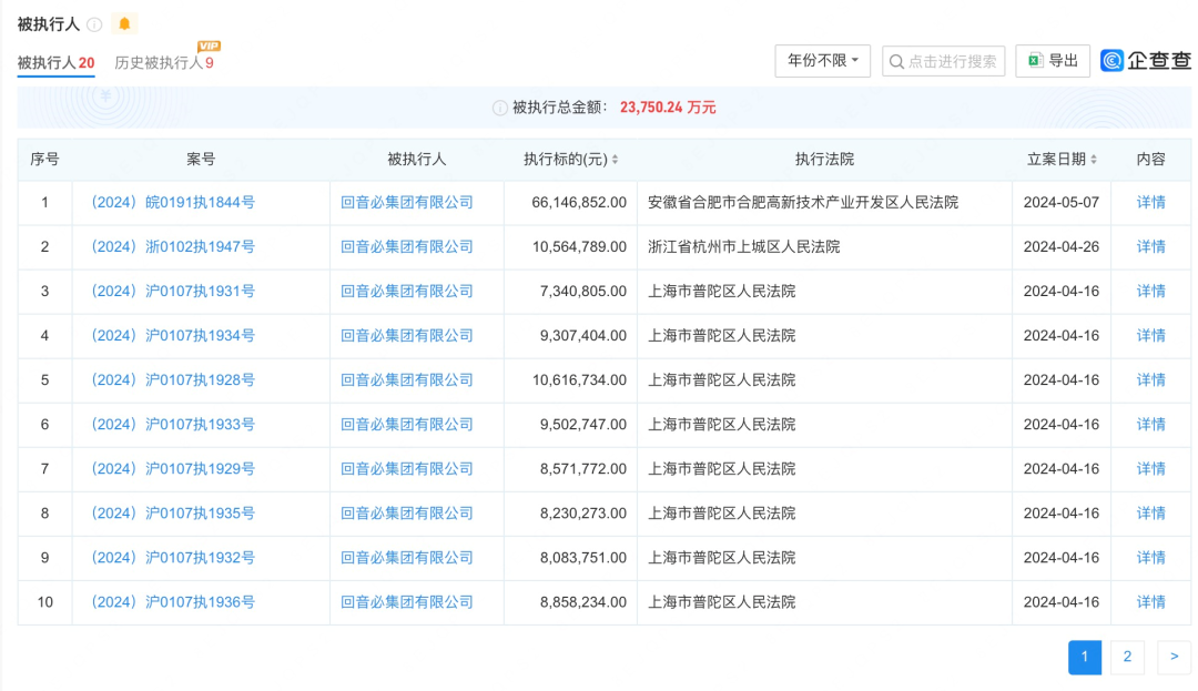 2023年12月以来有20条被执行信息,金额合计2.375亿元。今年1月以来,回音必新增4条限高信息和1条失信被执行信息。此外,还有金额不详的票据违约。