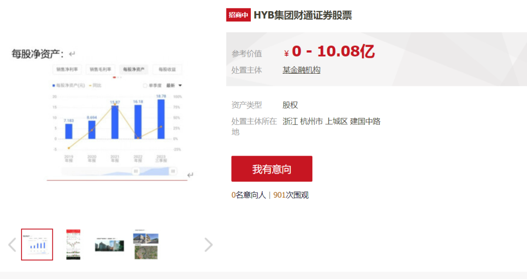 这一项在京东资产交易平台挂牌的金融资产,标的名称是“HYB集团财通证券股票“,处置主体为”某金融机构“。