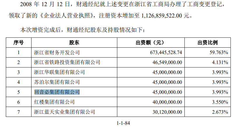 要知道,财通证券招股书中,有17次提及回音必集团有限公司(简称:回音必)。早在2008年,回音必就以2.51元/股价格入股财通证券;彼时持股4,500万股,比例为3.993%,为并列第三的股东。