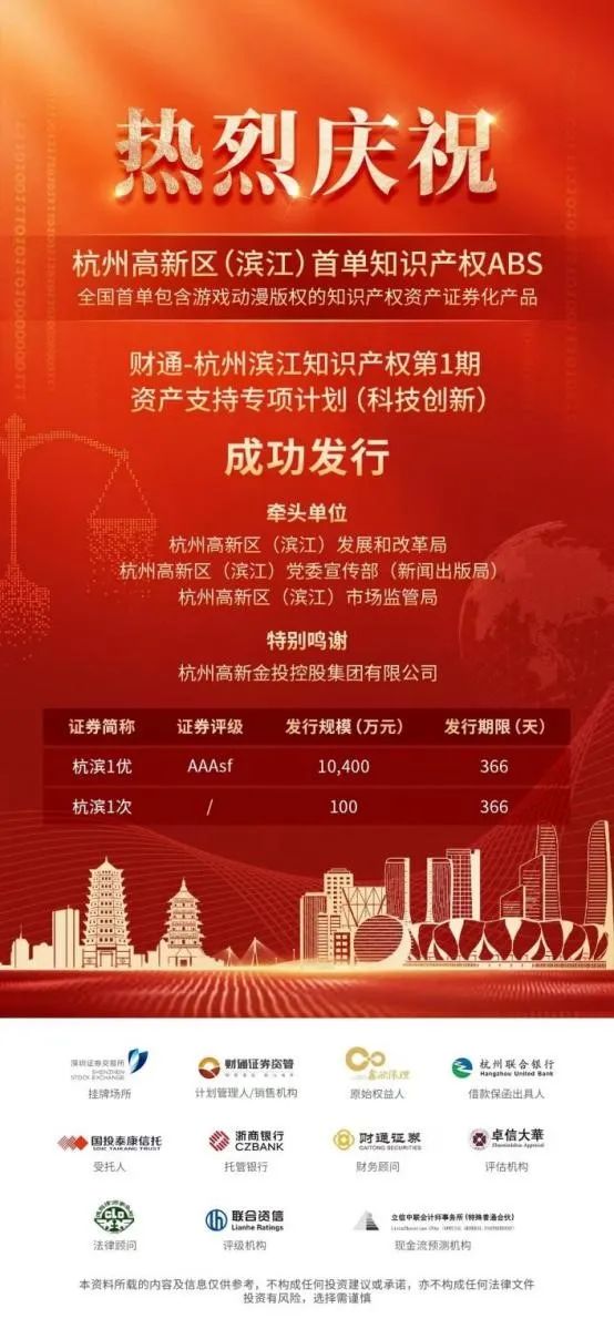 近日,由财通证券担任财务顾问、财通资管担任计划管理人的“财通-杭州滨江知识产权第1期资产支持专项计划(科技创新)”成功发行,实现直接融资规模1.04亿元,票面利率2.34%,这是杭州高新区(滨江)发行的首单知识产权ABS,也是全国首单包含游戏动漫版权的知识产权证券化产品。