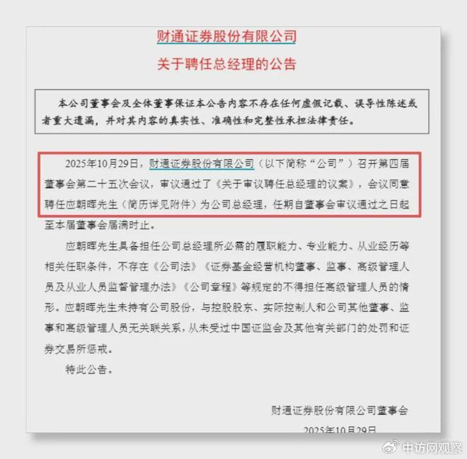 10月29日,市值超400亿元的财通证券迎来管理层关键落定,公司董事会正式审议通过聘任议案,由应朝晖出任总经理,任期至本届董事会届满。这位深耕浙江金融领域多年的实干派管理者,将接过经营管理重任,为这家省属头部券商注入新的发展动能。