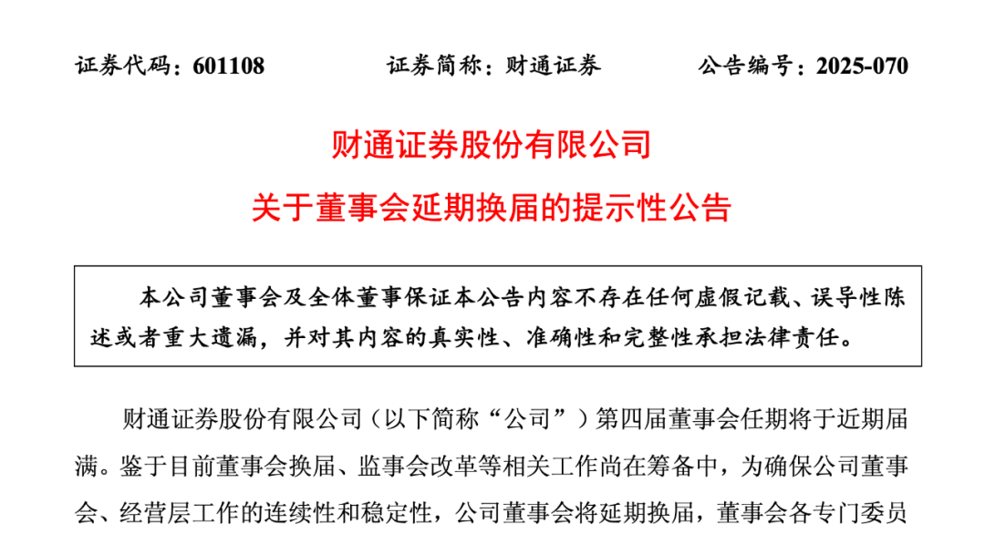 日前,财通证券股份有限公司发布关于董事会延期换届的提示性公告。公告显示,财通证券第四届董事会任期即将届满。然而,由于当前董事会、监事会改革等相关工作仍处于筹备阶段,为切实保障公司董事会、经营层工作的连续性与稳定性,公司决定将董事会延期换届,与此同时,董事会各专门委员会和高级管理人员的任期也相应顺延。