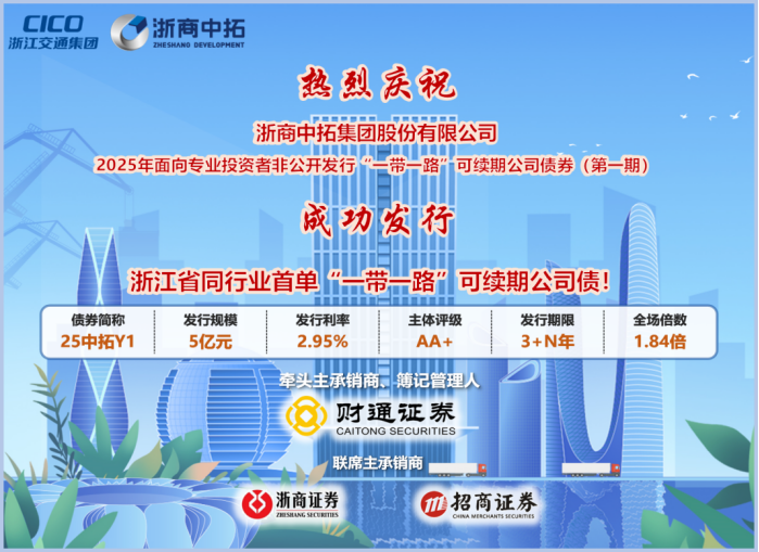 近日,由 财通证券 牵头主承销的 浙商中拓 集团股份有限公司2025年面向专业投资者非公开发行“一带一路”可续期公司债券(第一期)成功簿记发行。本期债券发行规模5亿元,期限为3+N年,全场认购倍数高达1.84倍,发行利率2.95%。